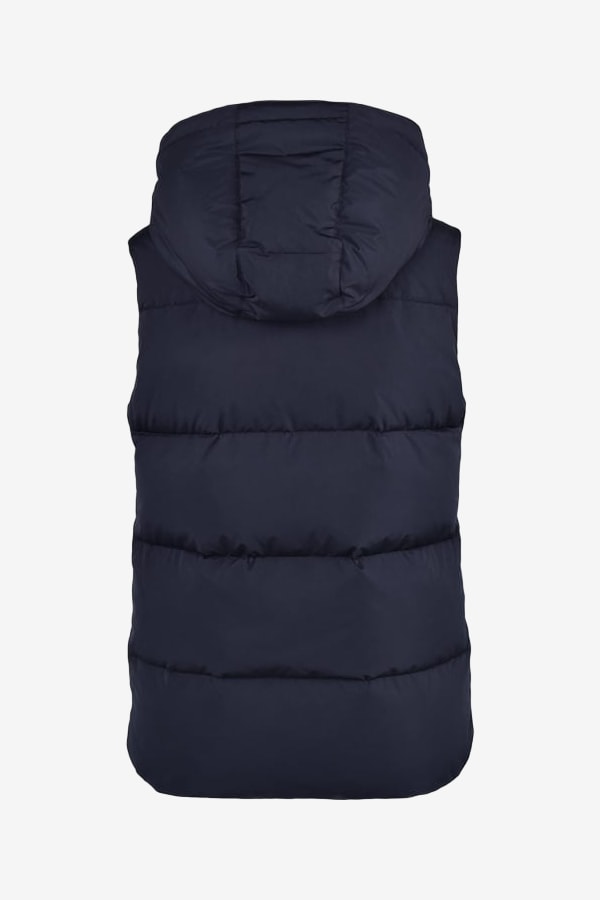 Marineblauw lichtgewicht donsvest met een afneembare, comfortabele capuchon.