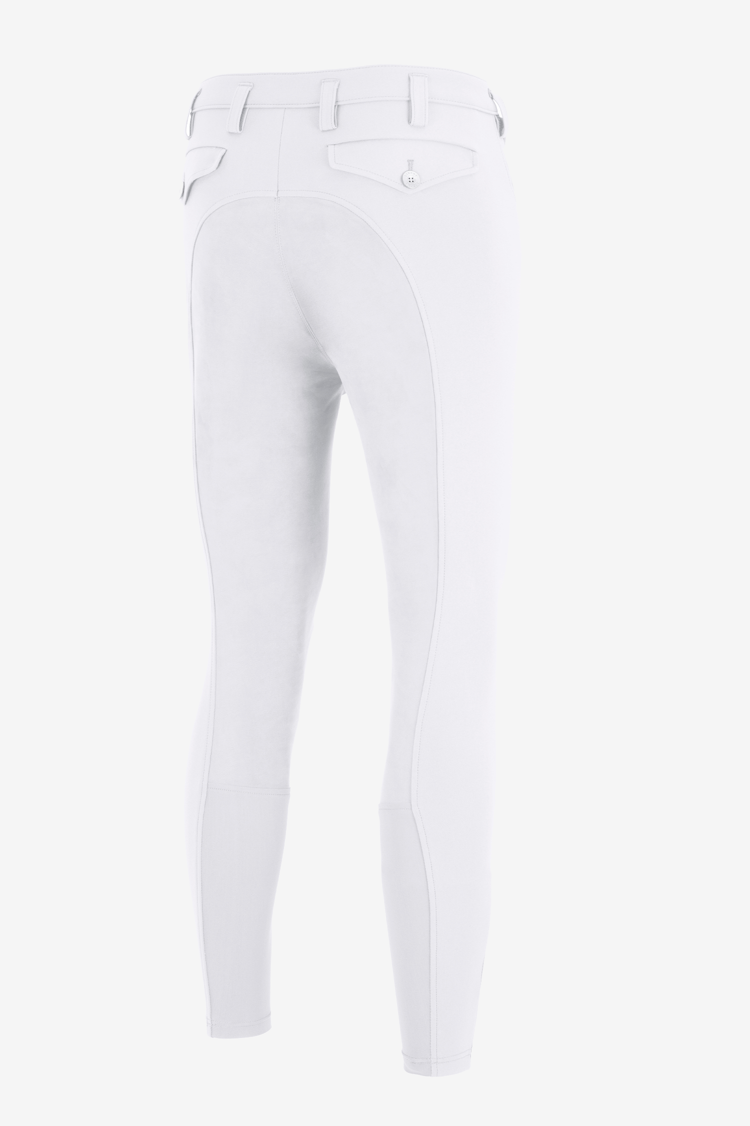 De rijbroek heeft twee comfortabele schuine steekzakken aan de voorkant en twee achterzakken met klep voor een stijlvolle uitstraling. Brede riemlussen maken het eenvoudig te combineren met een rijriem en zorgen voor een verzorgd geheel.