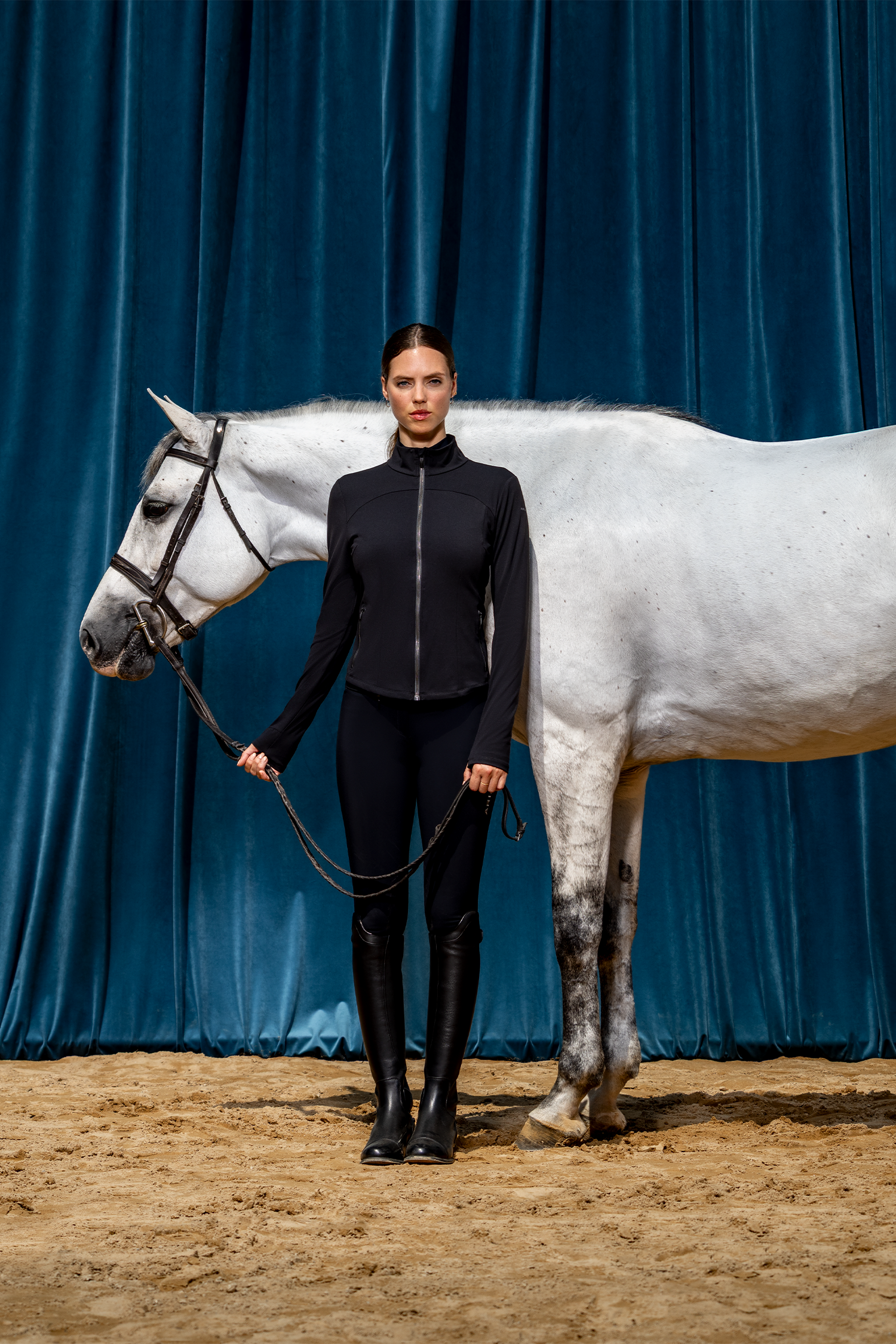 Het functionele materiaal reageert op de lichaamstemperatuur en helpt een aangename balans tussen warmte en koelte te behouden wanneer het activiteitsniveau varieert. Tegelijkertijd zorgt de geurregulerende functie ervoor dat het kledingstuk ook tijdens lange dagen fris blijft aanvoelen. De aansluitende pasvorm geeft een sportieve en soepele indruk, afgestemd op ruiters die volledige bewegingsvrijheid willen.