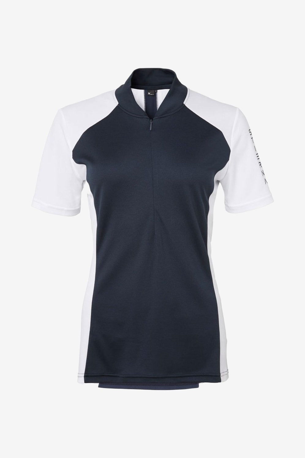 Stående krave med skjult lynlås. Den nederste del af trøjen har et asymmetrisk design for en bedre pasform ved ridning.
