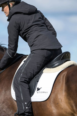 Beskytter dig mod sne, regn og vind, mens fugt og overskudsvarme hurtigt kan fordampe. Et vand- og vindtæt tøj med høj åndbarhed, alle sømme er tapede, og en dunfri letvægtsforing, der vil holde dig komfortabel selv på de koldeste dage. Det beskytter dig mod vejret, og uanset forholdene kan du og din hest præstere optimalt.