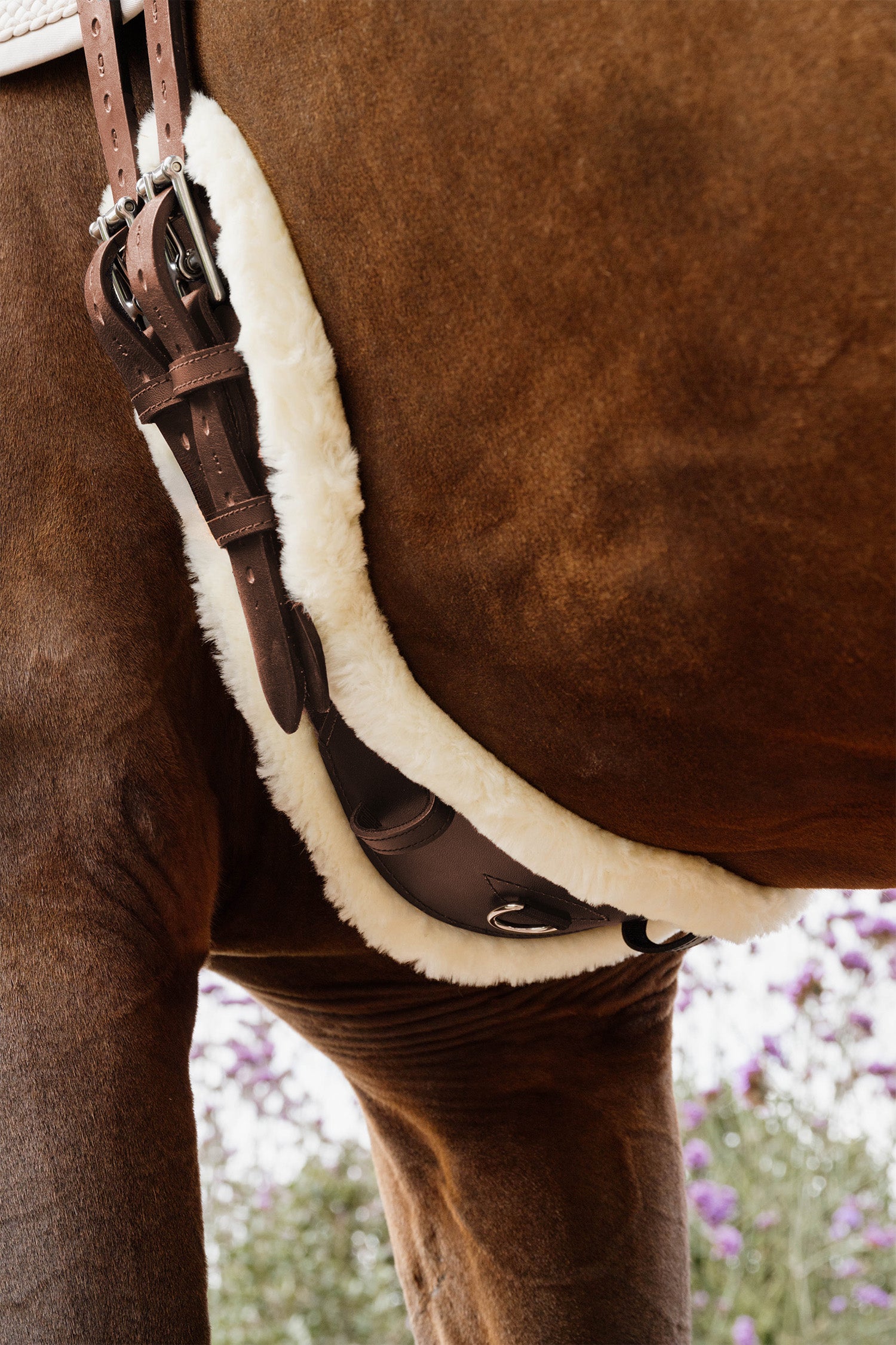 Das anatomische Design reduziert den Druck auf empfindliche Bereiche und bietet dem Pferd maximale Bewegungsfreiheit, besonders geeignet für Pferde, die zusätzliche Mobilität benötigen. Die Lederschlaufen halten die Strupfen während des Reitens und auf Turnieren ordentlich, während das weiche künstliche Lammfell Stoßdämpfung und Schutz für empfindliche Haut bietet. Dank des Klettverschlusses lässt sich das Lammfell einfach zum Waschen abnehmen.