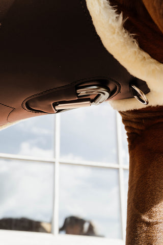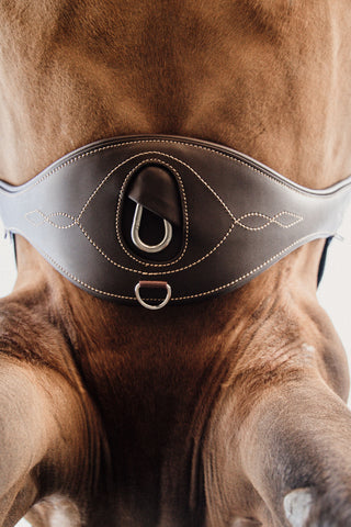 Ein anatomischer Sattelgurt unterscheidet sich von herkömmlichen Sattelgurten durch seine Form, die sich an den Körper und die Beinstruktur des Pferdes anpasst. Er ist oft mit einer leichten Biegung und einem extra breiten Bereich an der Brust des Pferdes gestaltet, um den Druck auf empfindliche Bereiche wie Brustbein und Rippen zu minimieren. Diese Form folgt den natürlichen Linien des Pferdebauchs und sorgt dafür, dass der Sattel an Ort und Stelle bleibt, ohne Unbehagen oder Reibung zu verursachen.