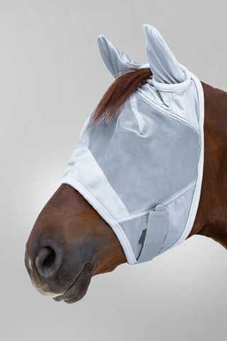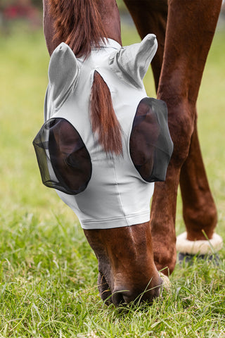 Neben dem Schutz vor Insekten bieten viele Fliegenmasken und einige Fliegenhauben auch UV-Schutz. Dies ist besonders wichtig für Pferde mit empfindlicher Haut oder hellen Bereichen um Augen und Maul.