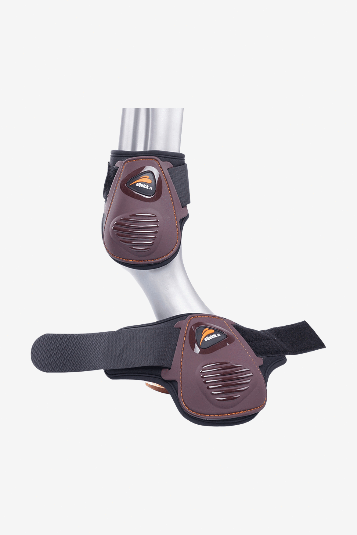 Hinterbein Gamaschen von eQuick. Schutz aus Neopren zusammen mit Lycra, verstärkt mit TPU-Schalen, die wie exklusives Leder aussehen und Stöße sehr gut absorbieren. Mit doppeltem Klettverschluss zu schließen.