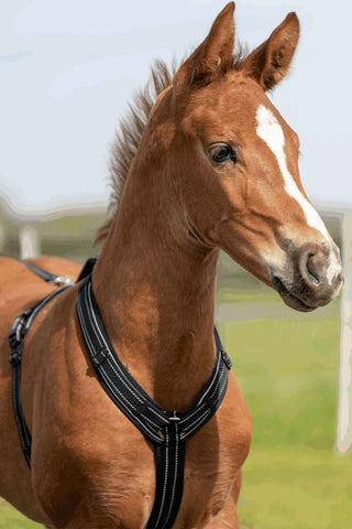 Fohlenhalfter von QHP mit silberfarbenen Schnallen, aus hochwertigem Leder gefertigt. In verschiedenen Fohlengrößen erhältlich.