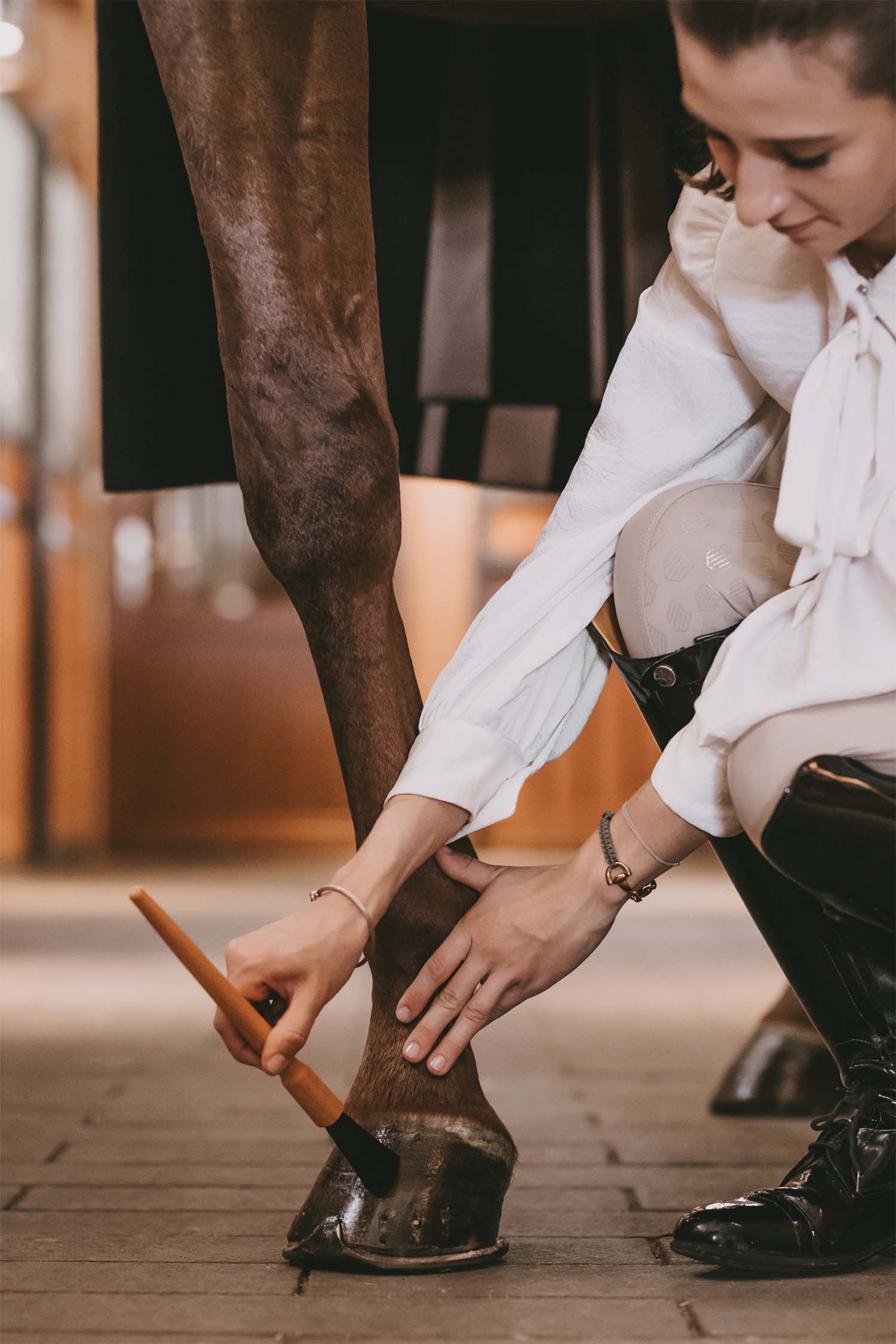 Mit einem anatomisch geformten Griff, sodass Sie die Bürste leicht halten und die Hufe Ihres Pferdes einfetten können.
