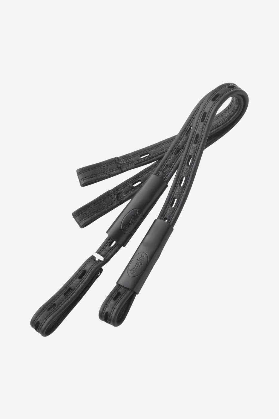 Nicht dehnbare Steigbügelriemen von Prestige. Weiche, geschmeidige Steigbügelriemen aus Kalbsleder mit eingenähtem Nylon für längere Haltbarkeit. Werden am Steigbügelbügel befestigt und mit T-Schnallen verstellt, die unter schützendem Leder verborgen sind, das über die Schnalle gezogen wird.