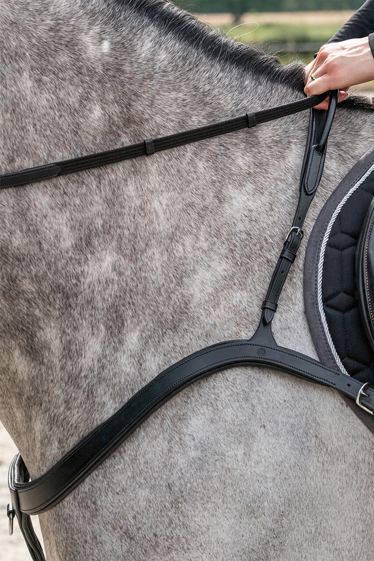 Der integrierte Griff ist rundgenäht für einen bequemen und sicheren Halt und so positioniert, dass der Reiter ihn bei Bedarf, zum Beispiel bei plötzlichen Bewegungen oder Gleichgewichtsverlust, leicht nutzen kann. Die Konstruktion des Vorderzeugs hilft, den Druck gleichmäßig über die Brust des Pferdes zu verteilen, was den Komfort erhöht und das Risiko von Scheuerstellen verringert.
