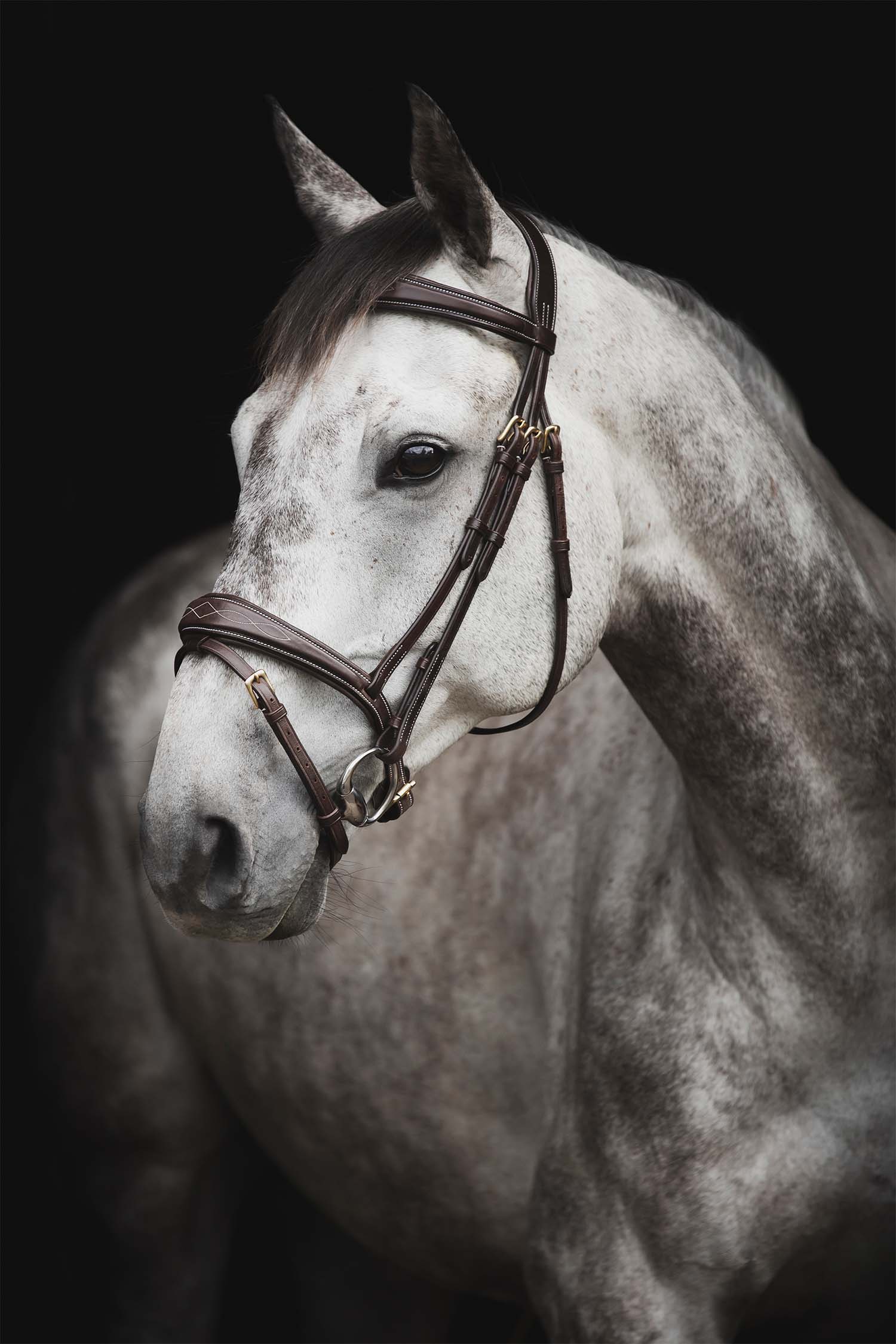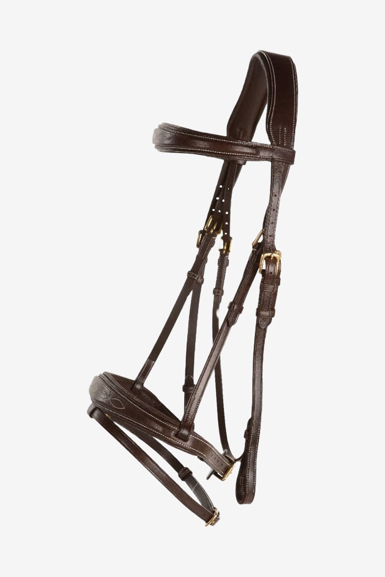 Anatomisch gepolsterter Genickriemen. Gepolsterter Nasenriemen und Stirnband mit dekorativen Nähten.