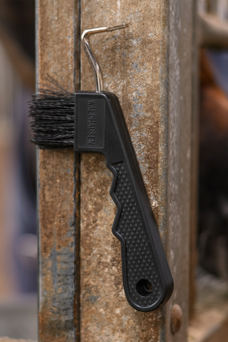 A hoof pick is one of the most important tools in daily hoof care. By regularly picking out the hooves, you keep them clean from dirt, gravel, and mud, while also being able to detect injuries, cracks, or signs of tenderness early on.