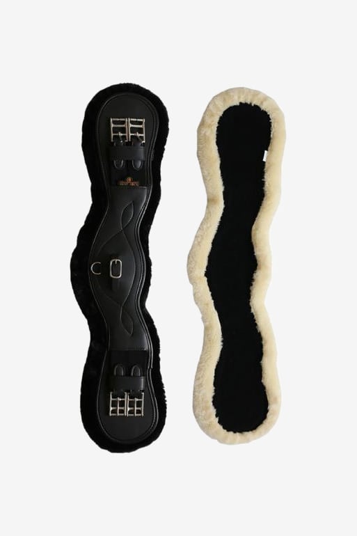 Anatomically shaped dressage girth from Kentucky with removable artificial sheepskin that prevents chafing on the horse. The girth is anatomically shaped to prevent discomfort and pressure on the horse. It is elastic on both sides to distribute pressure evenly. The girth also has a D-ring to attach auxiliary reins and is made of artificial leather for easy maintenance.
