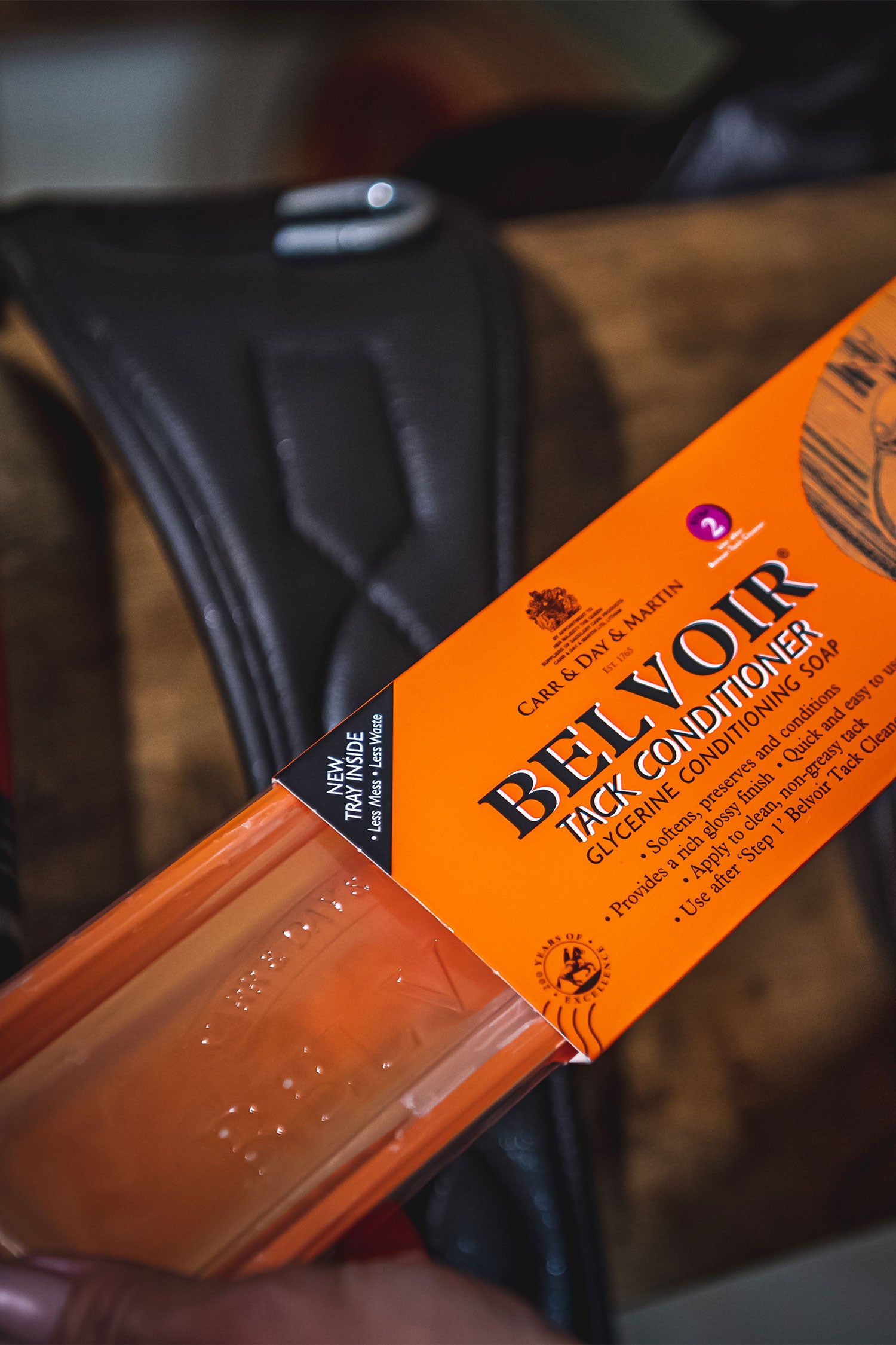 A traditional leather "soap" that protects and gives shine to the leather. Made from vegetable oils such as coconut oil and also glycerin, it is optimal for everyday use. The glycerin fills and seals the leather's pores, forming a barrier against salts from sweat, dirt, grease, and water. Use it after cleaning the leather from dirt and deposits with Belvoir Tack Cleaner Step 1.