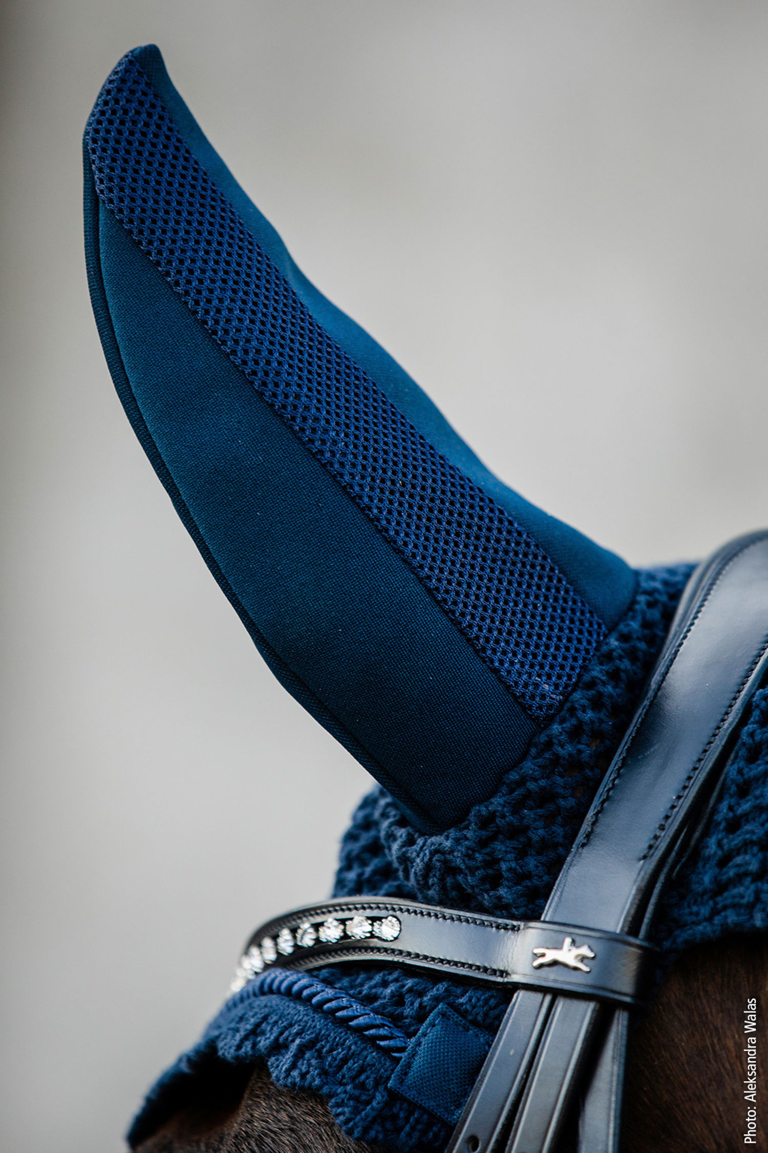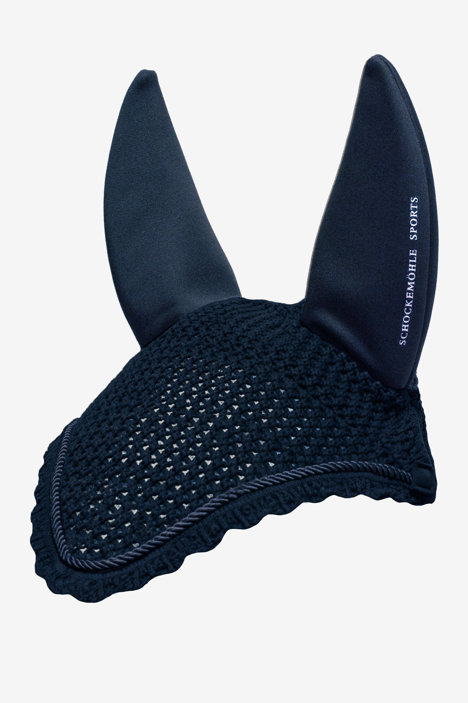Crocheted hood from Schockemöhle. The ears are insulated with neoprene to reduce noise intake and dampen external sounds that may disturb the sensitive horse. Hoods with sound insulation are very popular and have a good effect on noise-sensitive horses. Logo along the left ear and mesh fabric in a channel on the back of the ears to allow more air in.