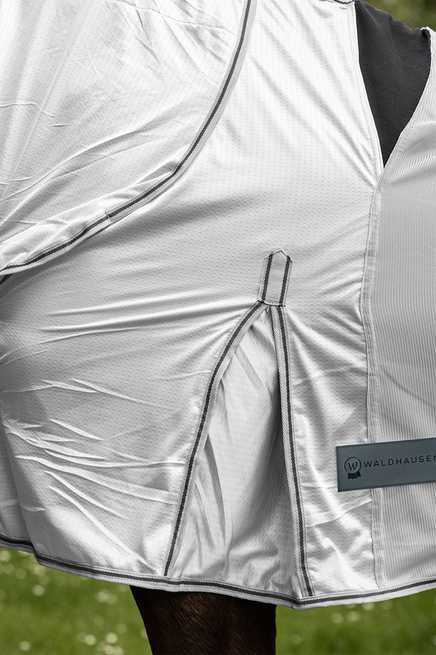 The neck and shoulder sections are made from an elastic and breathable functional material that offers a comfortable and flexible fit. The rug itself is made from a fine-mesh fabric that effectively keeps insects away while allowing air to circulate.