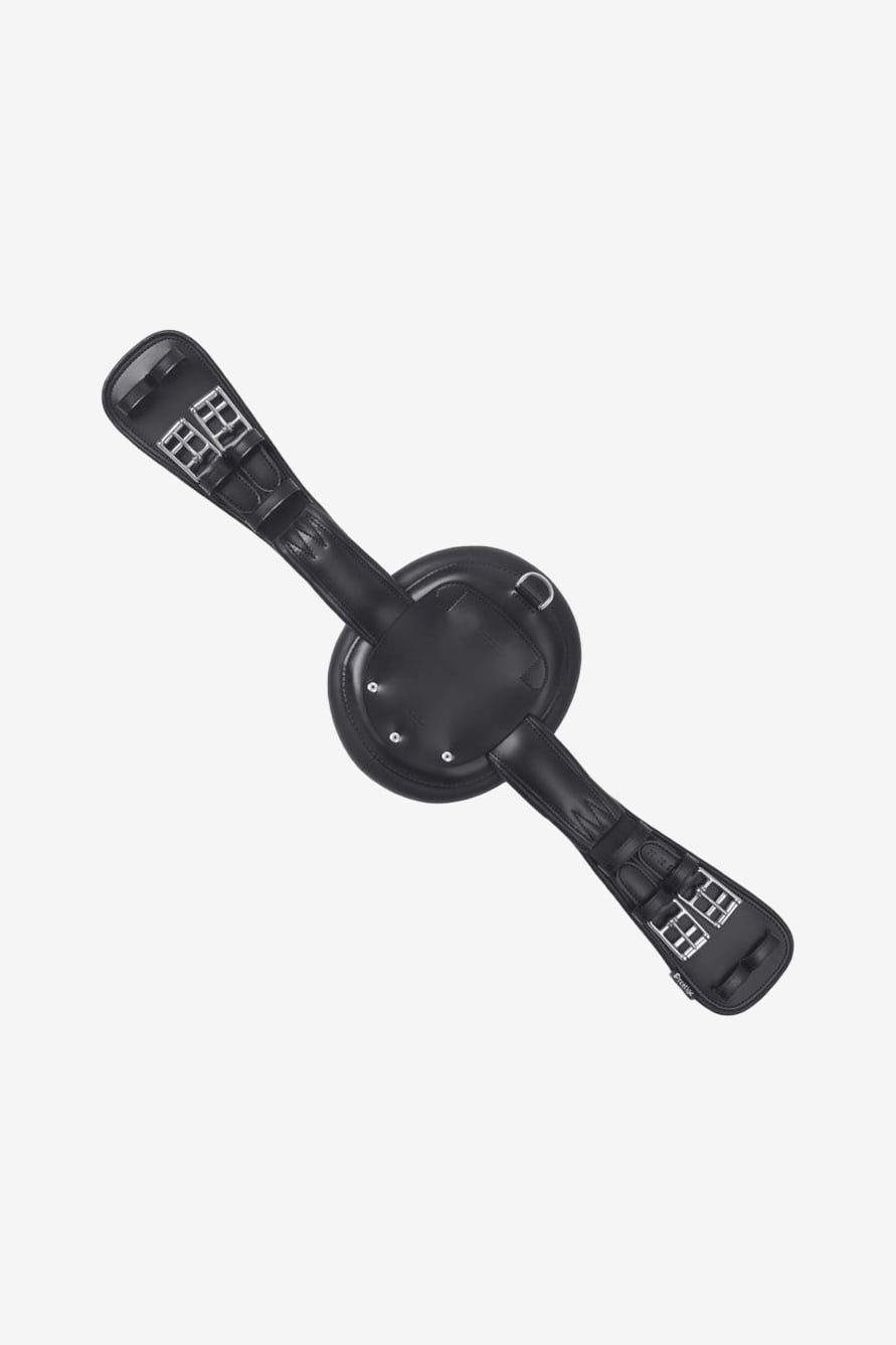 Sangle de dressage RP avec élastique de Prestige. La sangle de dressage RP 3A152 se distingue par son apparence remarquable et est conçue pour convenir aussi bien aux chevaux qu'aux poneys. La sangle RP est composée de deux parties : une plaque ronde et une sangle spécialement conçue qui glisse librement à travers la plaque. L'avantage est que la sangle peut glisser librement à travers la plaque ronde, qui reste stable, évitant ainsi de tirer sur la peau du cheval lorsque la sangle bouge. La pression de la sangle est répartie sur une plus grande surface grâce à la plaque, ce qui la rend plus confortable pour le cheval. Grâce à la forme ronde et aux trois inserts ovales internes en matériau extrêmement doux, elle agit comme un coussin d'air qui réduit encore la pression. Les passants pour la sangle améliorent également l'ajustement.