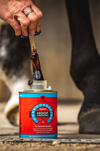 Les sabots doivent être propres et secs avant l'application. Utilisez un pinceau pour sabots pour répartir le produit uniformément sur la paroi du sabot et, si nécessaire, sur la couronne.