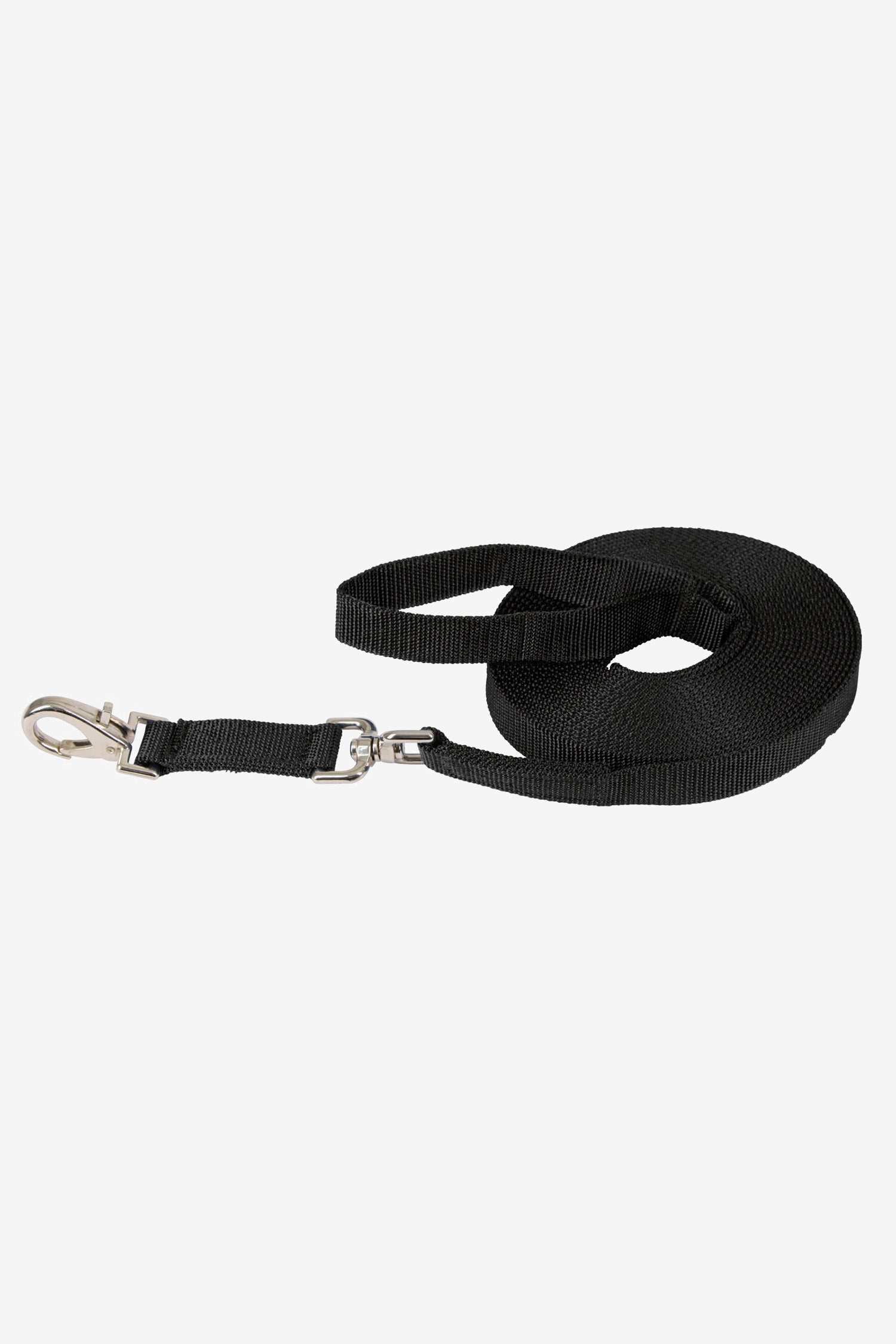 Une longe robuste fabriquée en sangle résistante 100 % polypropylène. La longe est équipée d'un pivot de haute qualité et d'un mousqueton, ce qui rend l'attache sûre et facile, tout en réduisant le risque d'emmêlement lors du travail à la longe.