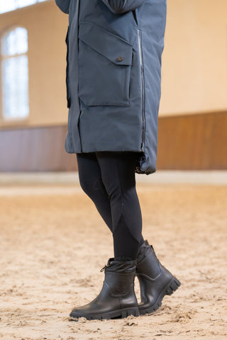 Le pro performance est un matériau évacuant l'humidité qui offre à la fois un bon maintien et une grande liberté de mouvement, une protection UV et une excellente respirabilité, ainsi qu'un léger effet sculptant et des propriétés de séchage rapide. Le pantalon taille haute, dont les bas de jambes sont réalisés dans une matière extra extensible pour un confort optimal, est également doté d'un fond intégral en Flex Cuir Synthétique, léger et extrêmement résistant. En plus d'offrir une meilleure adhérence et de favoriser votre stabilité en selle, le fond FFL élastique procure une sensation agréable et une surface lisse et élégante.