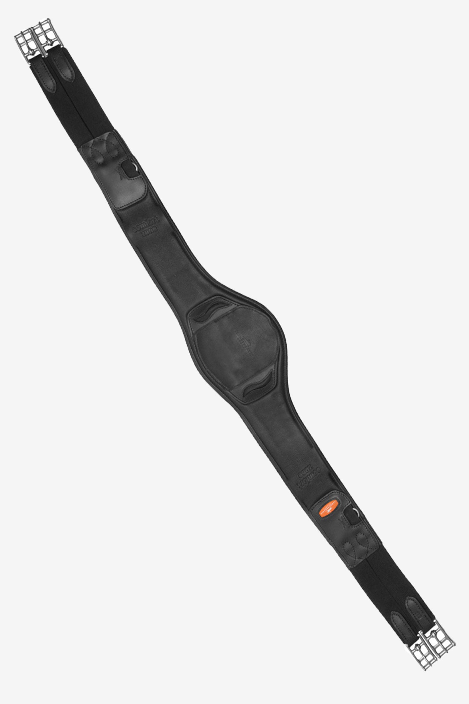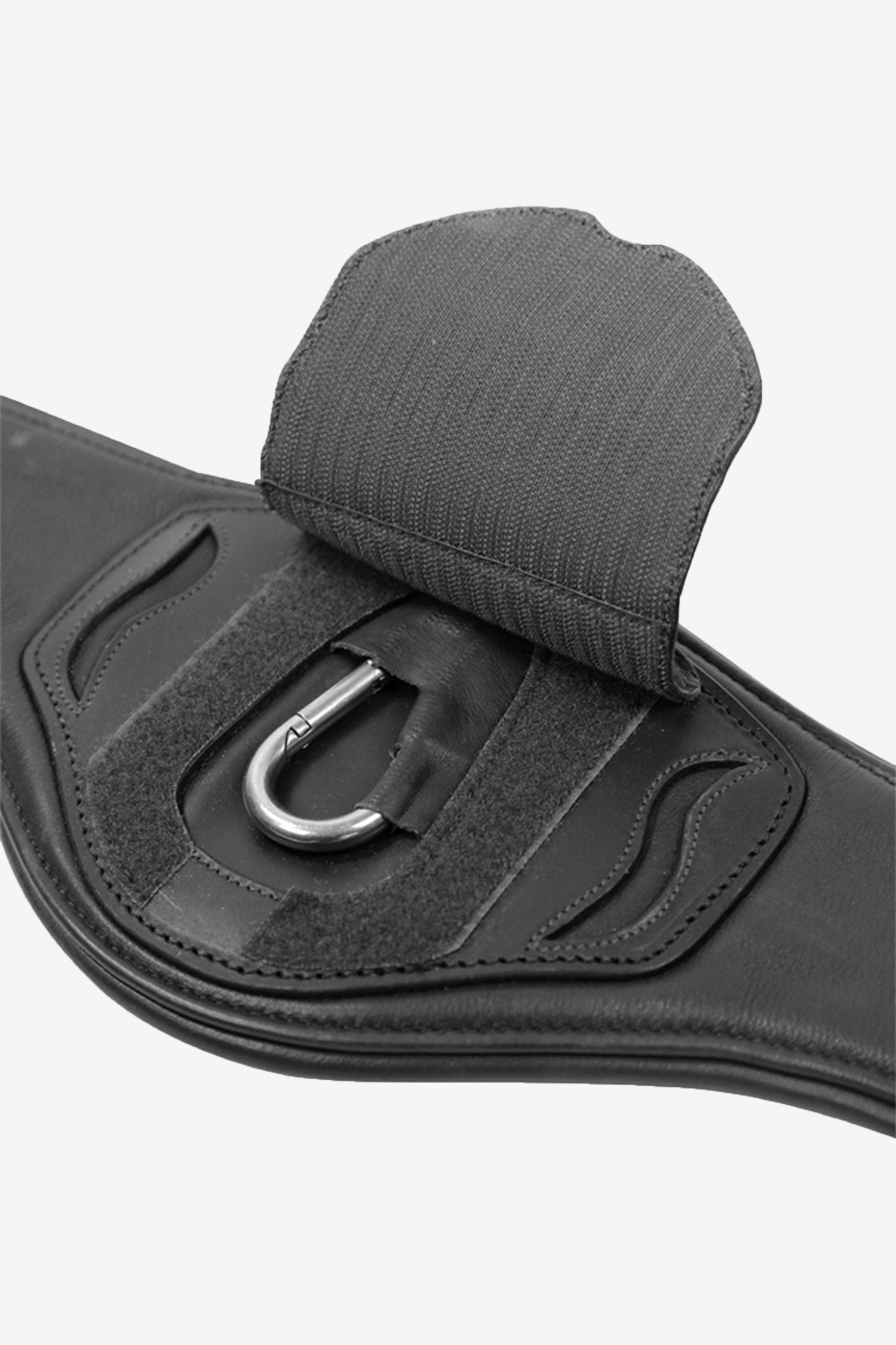 Pour encore plus de sécurité, le mousqueton peut être recouvert par le grand rabat en cuir. Deux anneaux en D sur les côtés offrent encore plus de possibilités pour attacher des rênes auxiliaires. Disponible en noir/argent et marron/argent, la sangle est équipée d'un élastique triple pli de chaque côté et de solides boucles à rouleau avec un rembourrage doux.