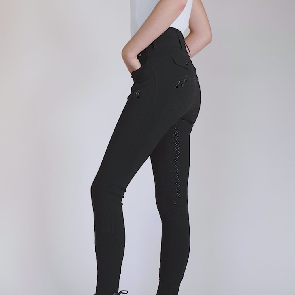 Het A-vormige ontwerp zorgt voor een perfecte silhouet, ideaal voor ruiters met een smalle bovenlichaam en bredere heupen, wat zorgt voor een op maat gemaakte pasvorm. De broek is versterkt met een Tanatex® anti-stof en waterafstotende behandeling voor extra bescherming en een zorgeloze rit.