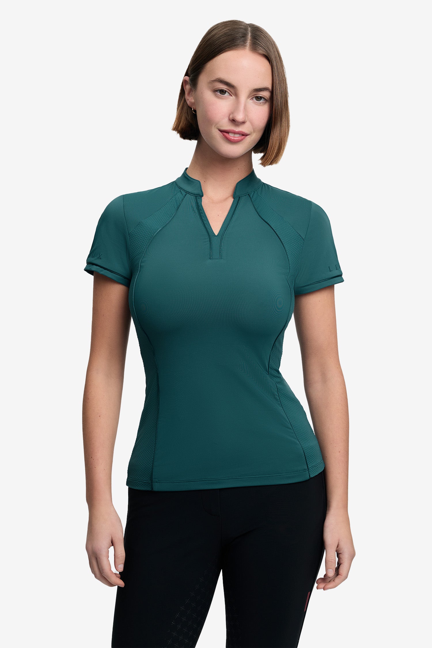 De Lisa Mesh Base Layer geeft een moderne en vrouwelijke twist aan het klassieke rijshirt. Het unieke halsontwerp met split en kraag zorgt voor een stijlvolle en sportieve uitstraling en geeft tegelijkertijd een meer open en luchtig gevoel.