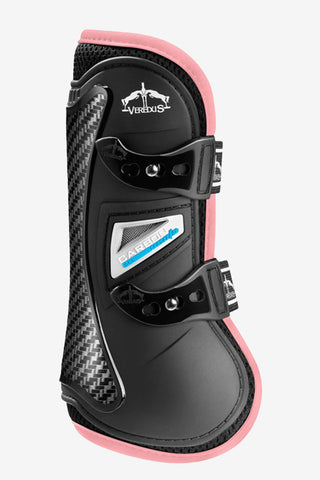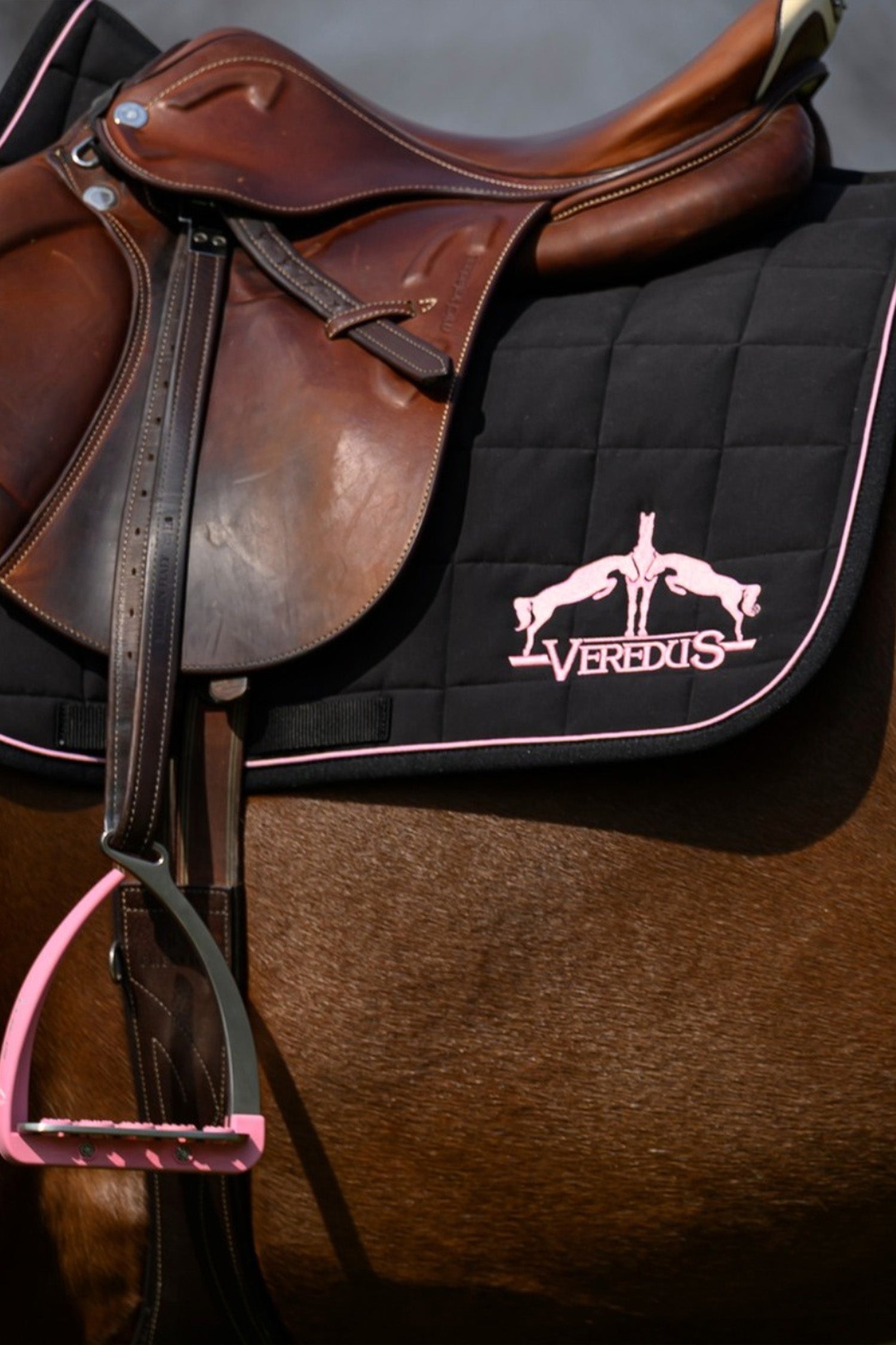 Deze exclusieve set van Veredus combineert elegant design met hoge functionaliteit – perfect voor de ruiter die een uniforme en stijlvolle uitstraling wil. De set bestaat uit een zwart zadeldek met lichtroze details, een bijpassende oornetje en witte veiligheidsbeugels in modern design.