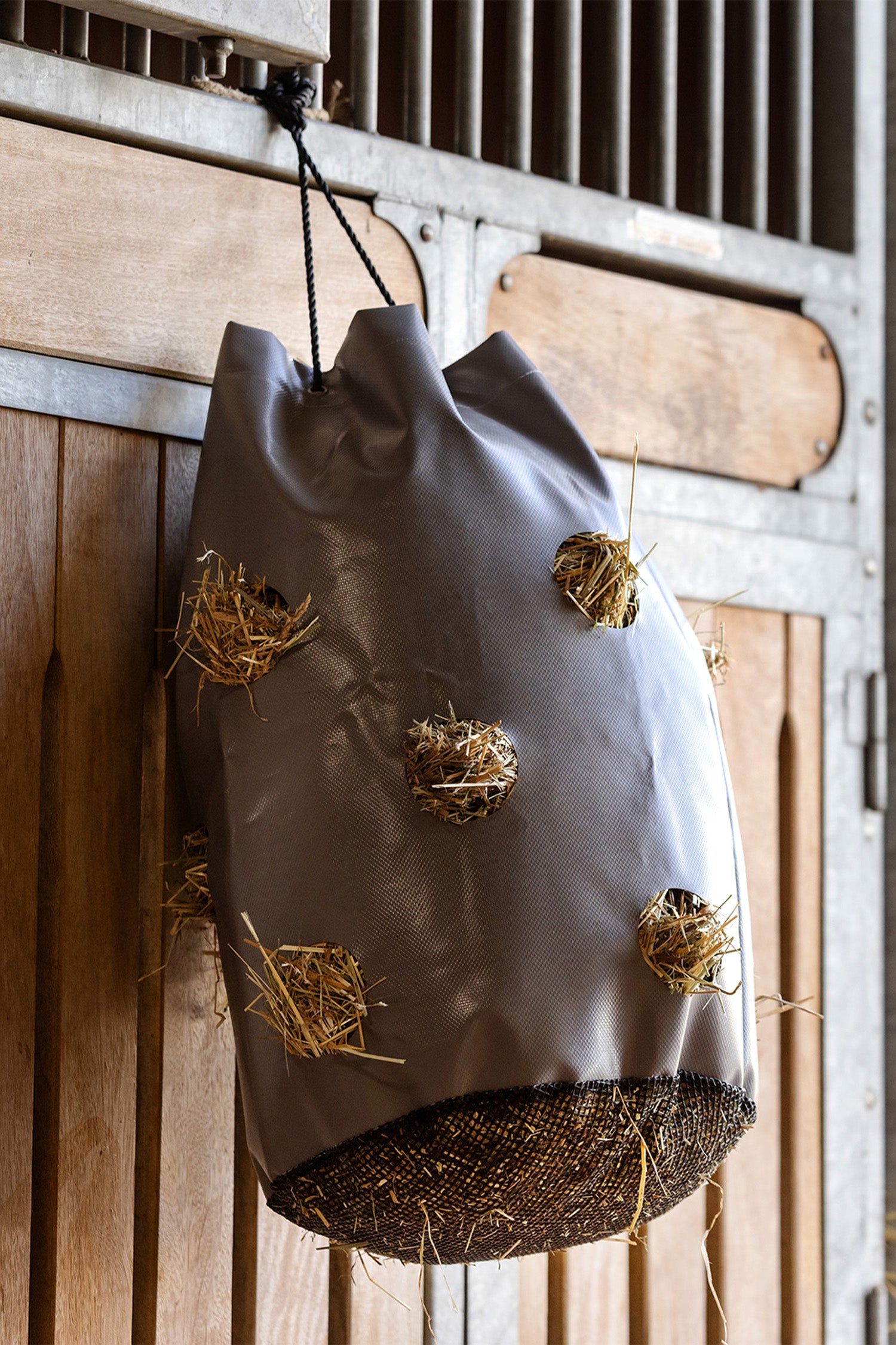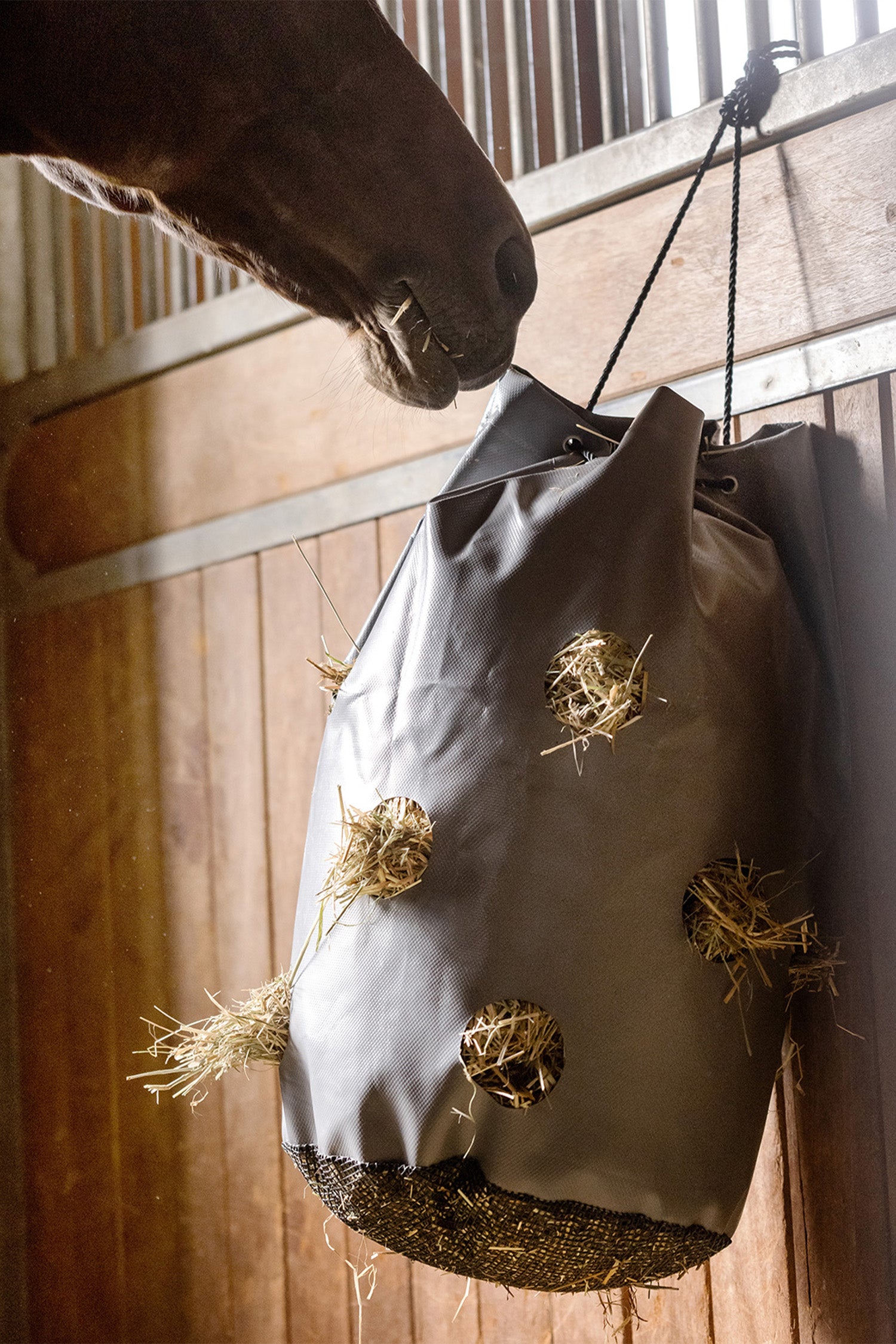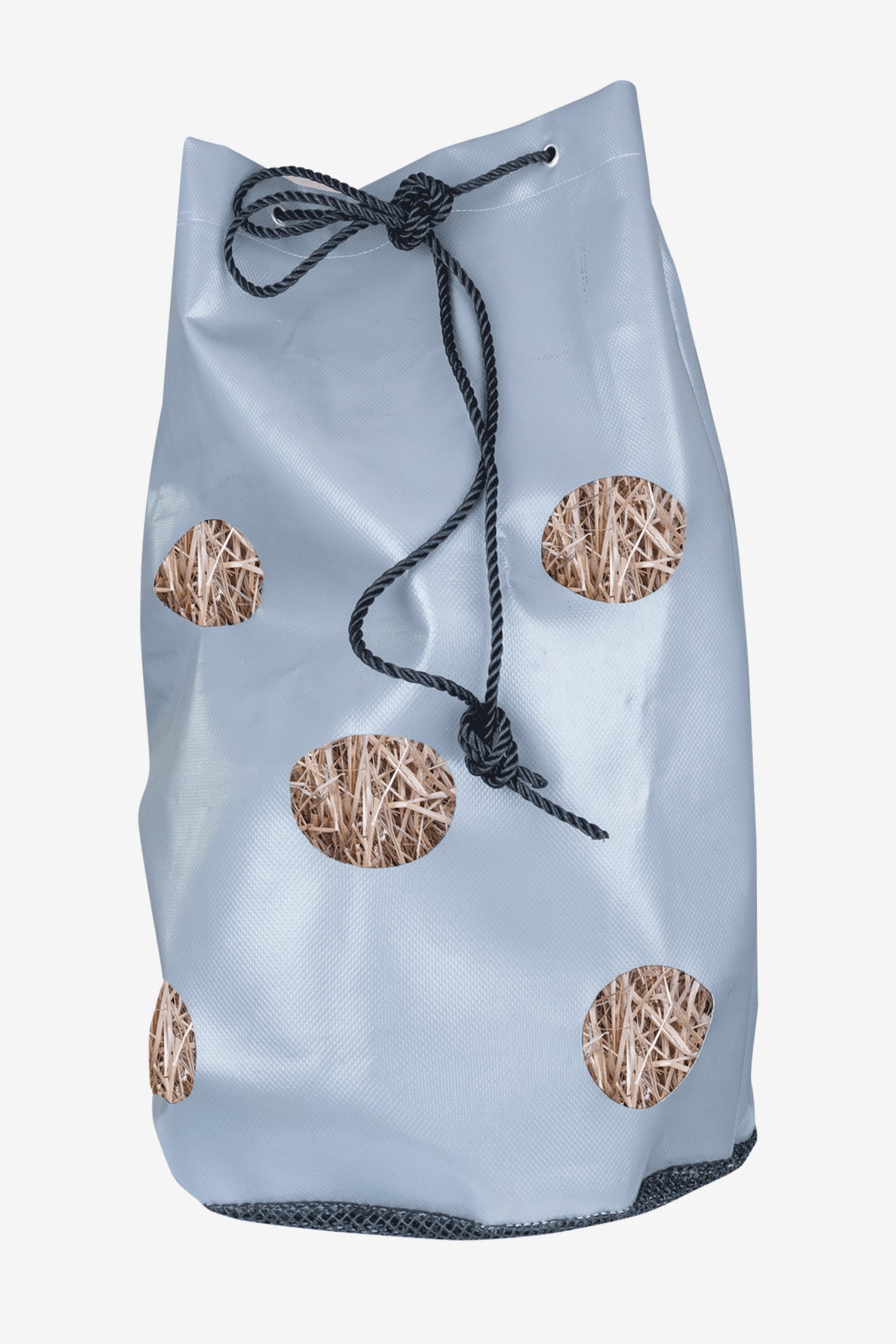 Den här hösäcken är en smart och skonsam lösning för daglig utfodring av din häst. Med 12 rundade hål (ca 8 cm i diameter) främjar den långsam och naturlig foderkonsumtion – vilket inte bara gynnar matsmältningen utan även minskar risken för skador i hästens mun tack vare den släta ytan.