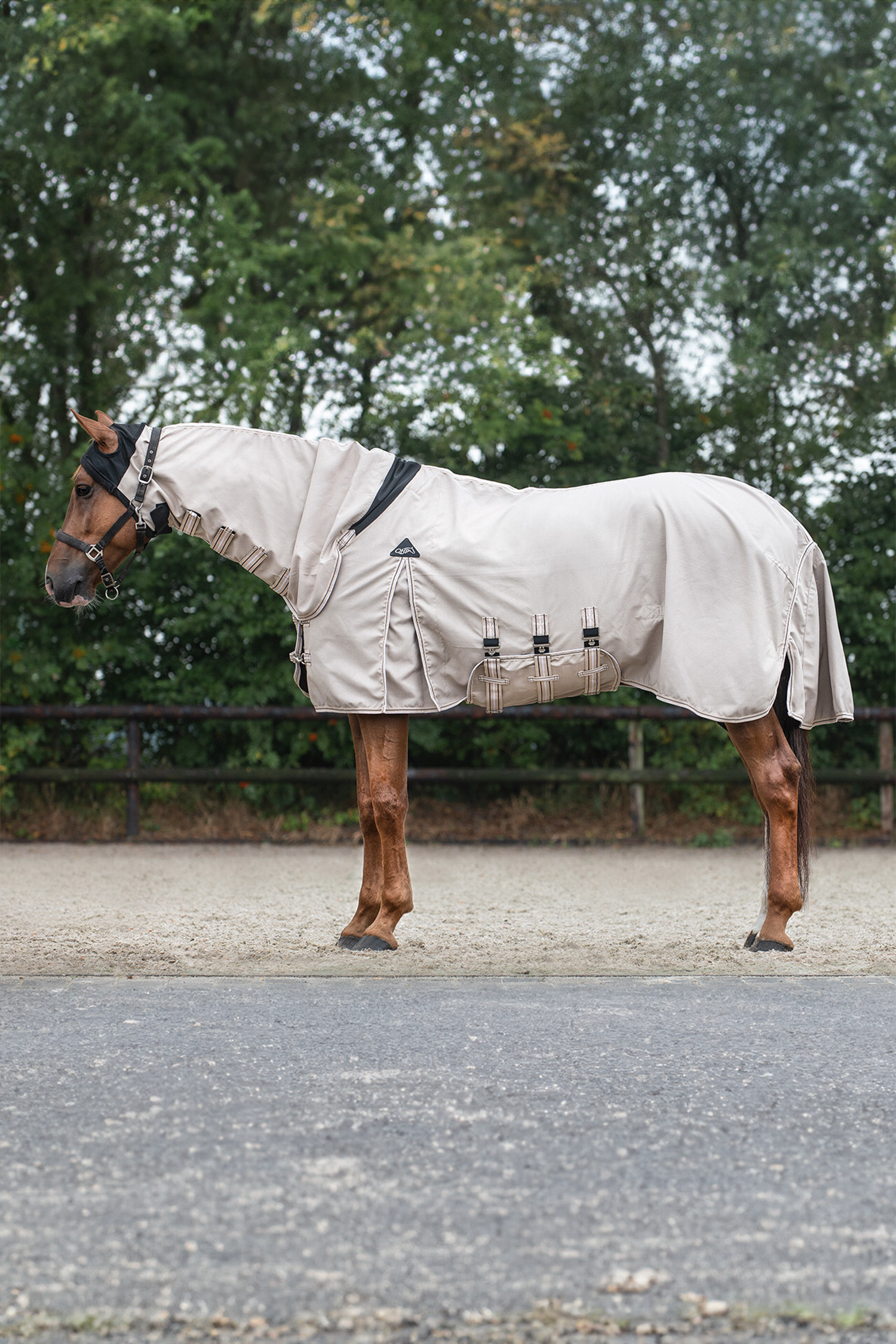 Täcket är tillverkat i slitstarkt och rivtåligt material som är anpassat för daglig användning i hage. Halsdelen fortsätter upp över huvudet och har öppningar för öronen, vilket ger ett heltäckande skydd utan att begränsa hästens rörelsefrihet. Vid manken finns elastiskt material som ger extra rörelsefrihet och bättre passform.