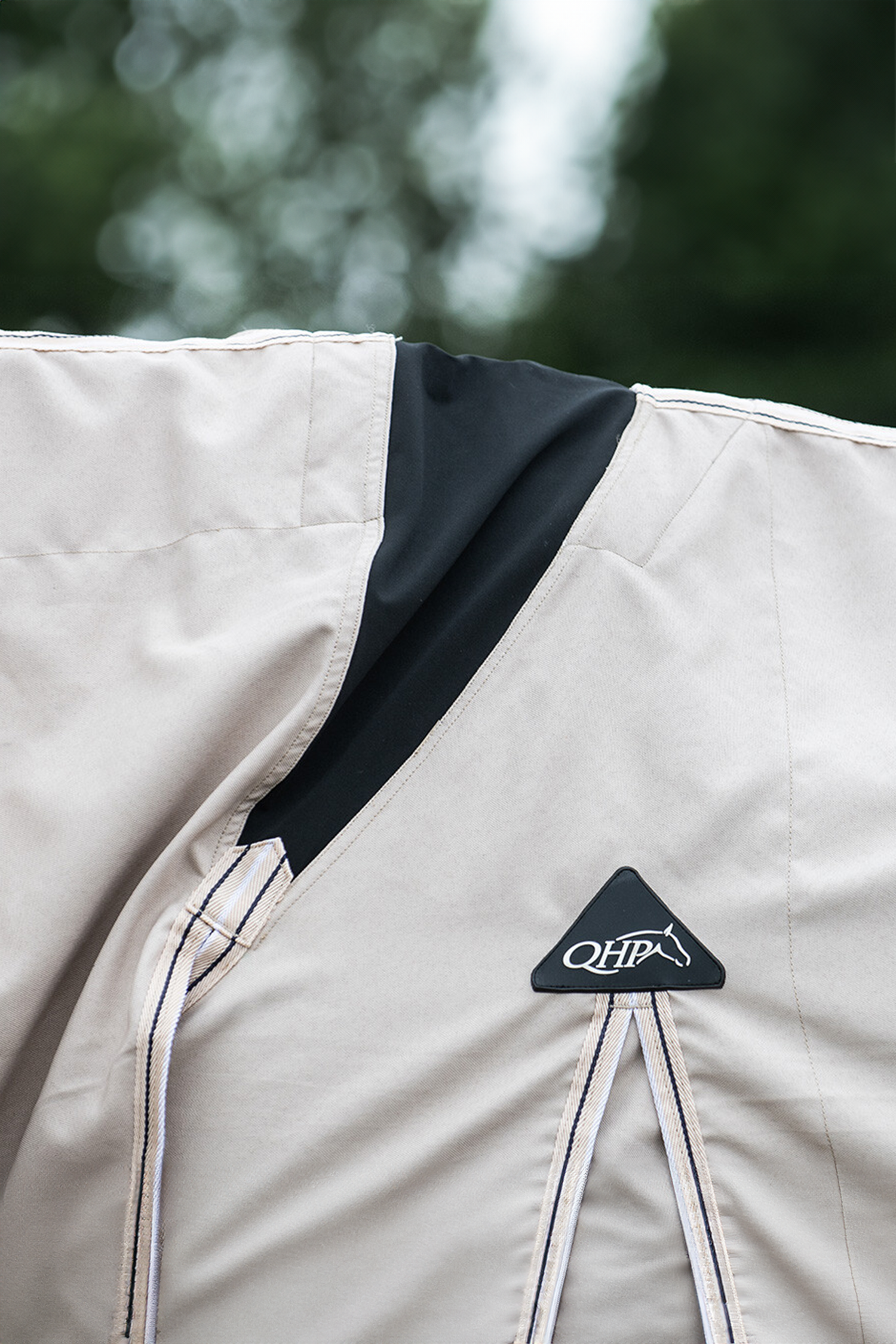 Den breda bukfliken med tre gjordar håller täcket stabilt på plats även när hästen rör sig. Den stora svanslappen är stängd i sidorna för ökat skydd bak och har en elastisk ögla på insidan där svansen kan träs igenom för att hålla täcket på plats.