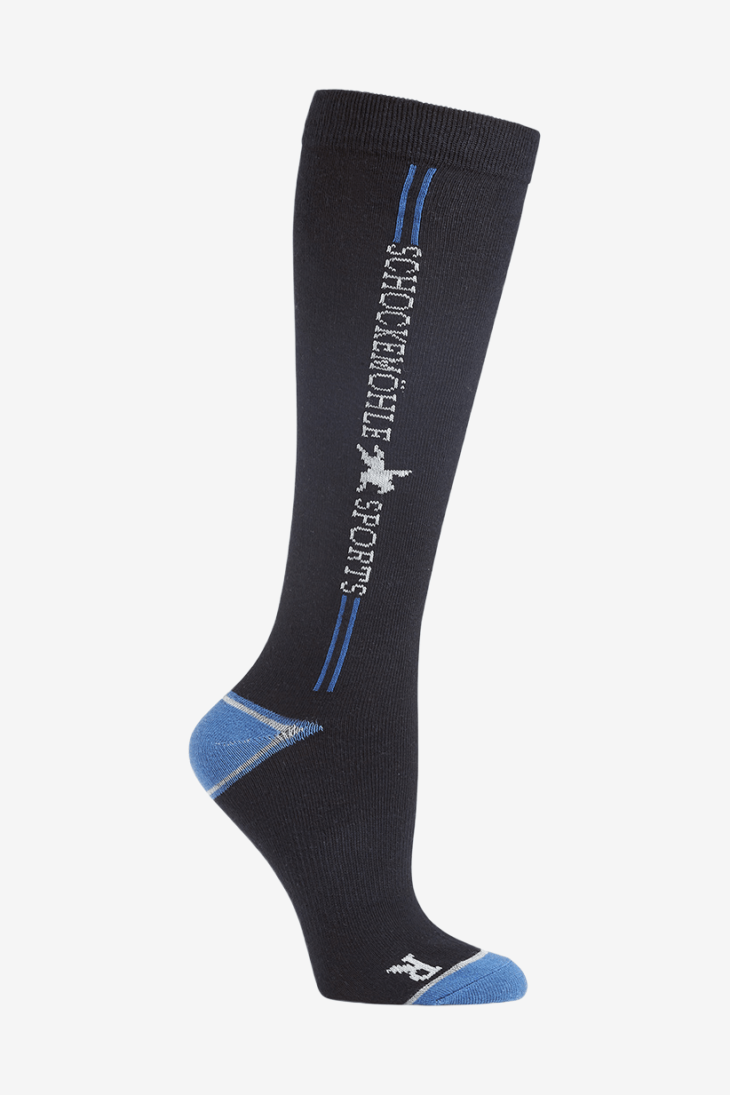 Knähöga strumpor med Schockemöhles logga på sidan.